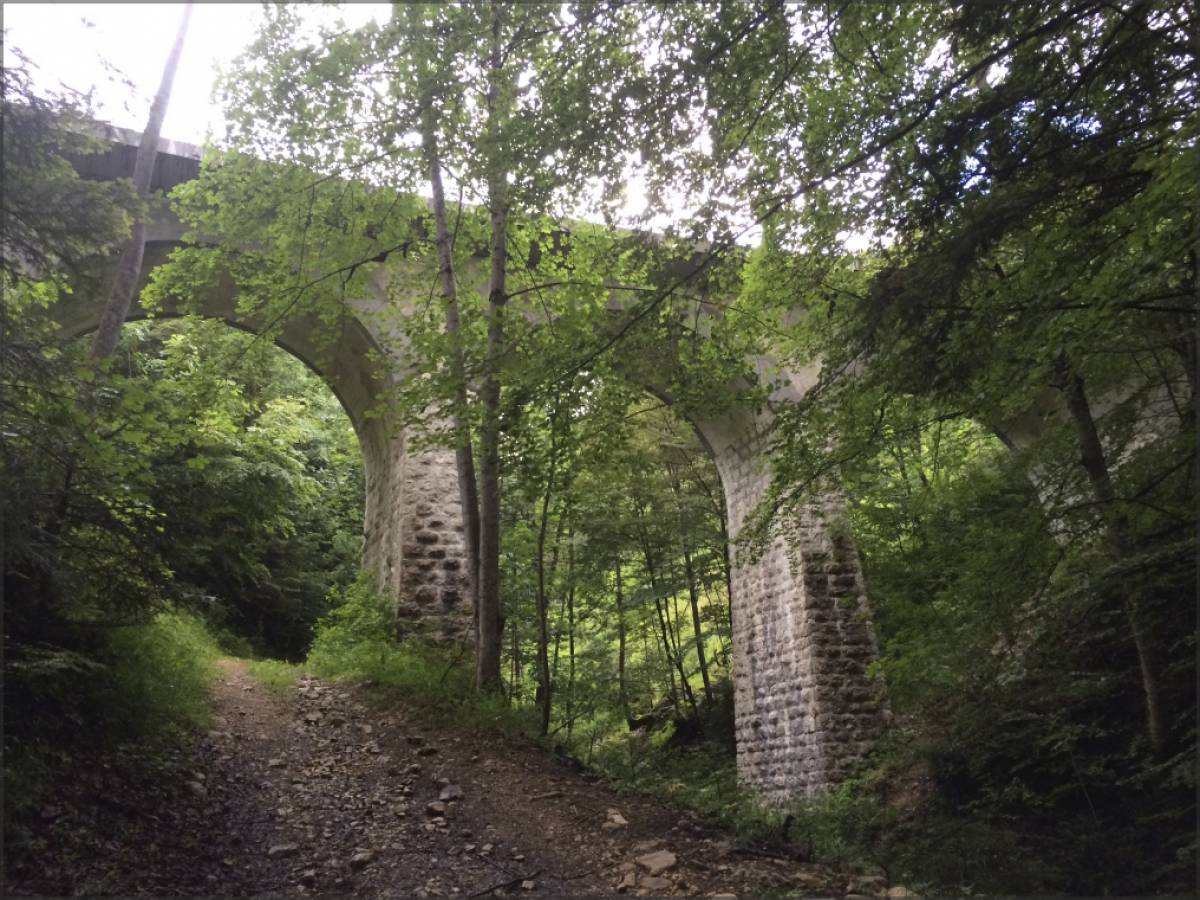 On continue alors en s'enfonçant dans le Bois Noir et on passe sous le pont en arc de la voie de chemin de fer. On traverse le ruisseau d'Oujon et on revient sur le village d'Arzier. On longe ensuite la voie de chemin de fer jusqu'à la gare de Bassins.