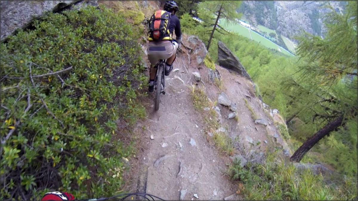 D'Ottafe, après un très court passage sur bitume, on empruntera à nouveau l'Europaweg. Valloné à cet endroit, on le suivra jusqu'au point 1980 où débutera notre descente sur Täsch. Ludique et principalement en terrain forestier, cette plongée dans la vallée mixe allègrement passages techniques et rapides, épingles et boucles serrées,...bref inutile de dire qu'arrivé à Täsch, c'est chaud bouillant que l'on aura envie de continuer...