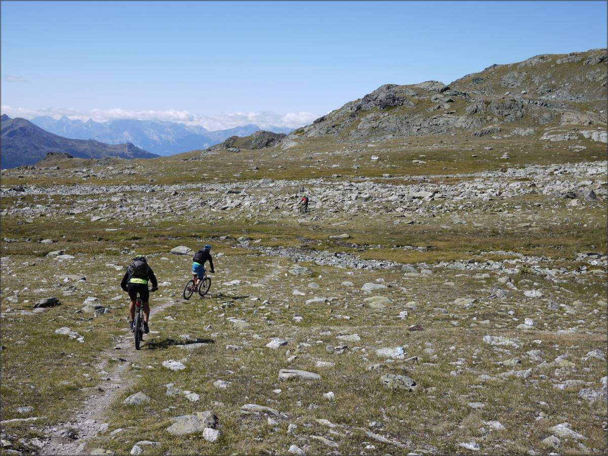 Le Meidpass se prête fantastiquement bien à une pause pic-nic. Puis, c'est une descente dans un grandiose décor alpin, d'abord sur le Lac d'Armina où un bref coup de cul permet de rejoindre la Fêta d'Août avant de poursuivre sur la Cabane Bella Tola puis Chandolin, le tout sous l'oeil attentif de la Dent Blanche !